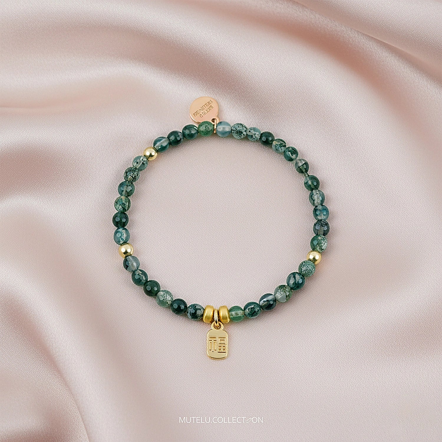 Rooted in the calm energy of nature, Fú is crafted from green agate beads — a stone of emotional stability and protection — and adorned with a delicate gold charm engraved with the Chinese character 福 (blessing).